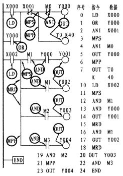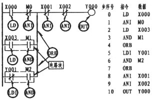 由上圖可以看出,第一支路X003的常開觸點與M1的常開觸點成串聯關系(在這樣的情況下,形成了塊的關系),它是與上一行的X000與M0串聯后相并聯,此時程序的編寫,如步序號0、1、2、3、4所示。4所出現的第一個ORB指的是與上一行并。而第二支路,常閉Y001與M2同樣是串聯關系。也是一個塊結構,其串聯后再與第一支路并。故步序7再次出現ORB。ORB指令并無梯形圖與數據的顯示。可以這樣認為;它是下一行形成電路塊的情況下與上一行并聯的一條垂直直線(如圖中所示的二條粗線)。