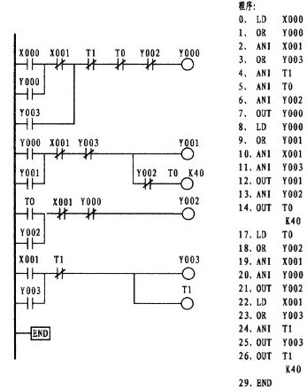 程序:0、LD X000 1、OR Y000 2、ANI X002 3、ANI X001 4、ANI Y001 5、ANI Y002 6、OUT Y000 7、LD X001 8、OR Y001 9、ANI X002 10、ANI X000 11、ANI Y000 12、ANI Y002 13、OUT Y001 14、LD X002 15 、OR Y002 16、ANI T0 17、OUT Y002 18、OUT T0 K 40 21、END