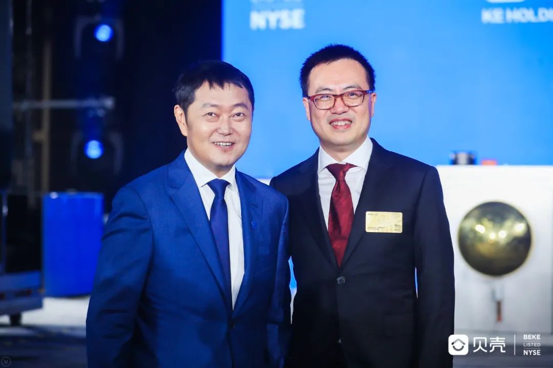 貝殼找房創(chuàng)始人兼董事長左暉(左)與紅杉資本中國基金合伙人劉星(右)在上市儀式現(xiàn)場