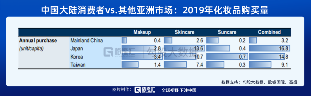 所謂市場發(fā)展?jié)摿Υ螅簿褪翘旎ò甯撸司瘖y品消費水平的上升空間大。歐睿國際數(shù)據(jù)顯示,2019年我國消費者人均購買3件化妝品。對比之下,日韓消費者人均購買15~17件化妝品。再從價格上來看,數(shù)據(jù)顯示,2017年中國化妝品人均消費額約為39美元,而同期,美國、日本、韓國的化妝品人均消費額卻分別高達240美元、292美元和220美元。