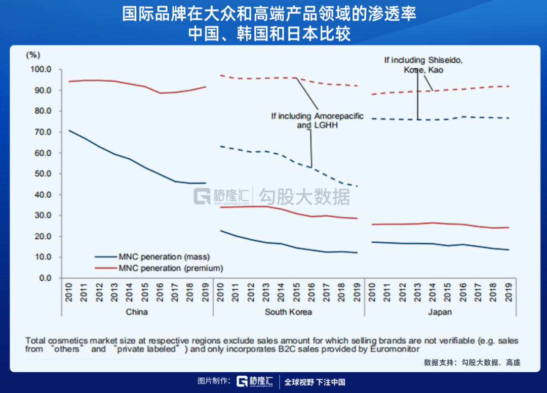 如果參考其他的亞洲國家,可以發(fā)現(xiàn)隨著市場的發(fā)展,國際品牌的市場份額最終會被成熟的本土品牌奪走,例如日本和韓國。所以,"四舍五入",我們或許可以直接下結(jié)論稱在中國的化妝品市場上,外資大牌終將會被本土大牌替代。