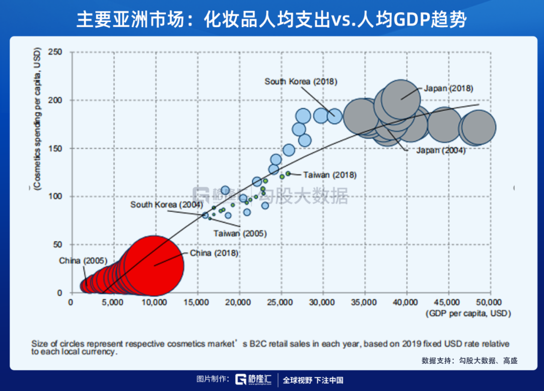 參考其他亞洲國家的情況可發(fā)現(xiàn),化妝品消費水平和GDP之間存在較強的正相關(guān)關(guān)系。2019年中國化妝品支出/實際GDP為0.3%,而日韓的占比則為0.5~0.6%。