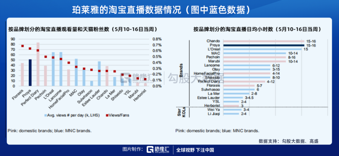 而且,與國產(chǎn)品牌相比,盡管國際大牌們的線上渠道占比較低,但它們也在加速線上布局,同時開始在低線城市開設(shè)專營店。今年6月以來,歐萊雅、雅詩蘭黛等國際品牌的淘寶直播場次排名已經(jīng)沖到前列。無論在累計直播時長還是直播轉(zhuǎn)化率上,國產(chǎn)品牌和國際大牌之間并沒有明顯差距。